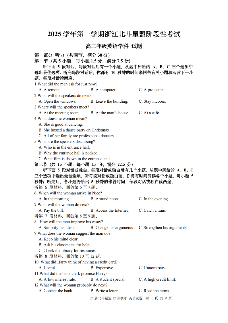 高三英语--浙江省北斗星盟2026届高三12月联考