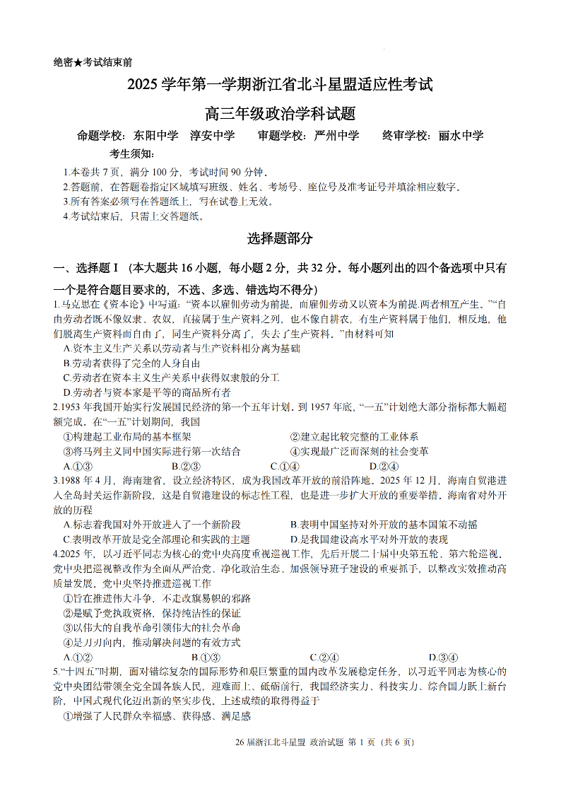 高三政治--浙江省北斗星盟2026届高三12月联考