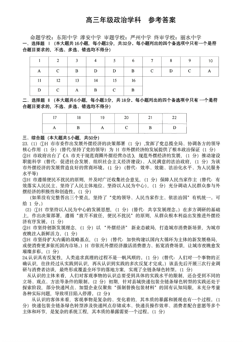 高三政治答案--浙江省北斗星盟2026届高三12月联考