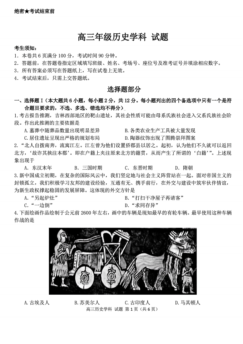 高三历史--浙江省北斗星盟2026届高三12月联考
