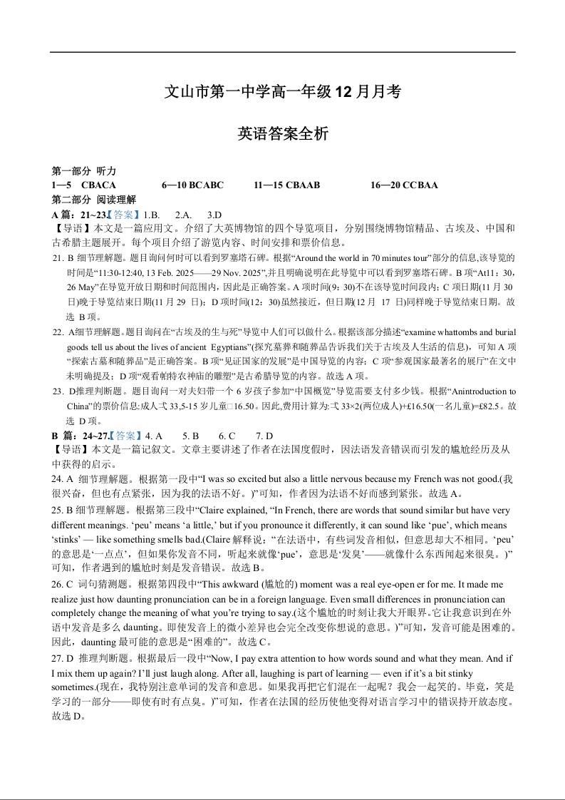 高一英语答案--云南省文山壮族苗族自治州文山市第一中学2025-2026学年高一上学期12月月考