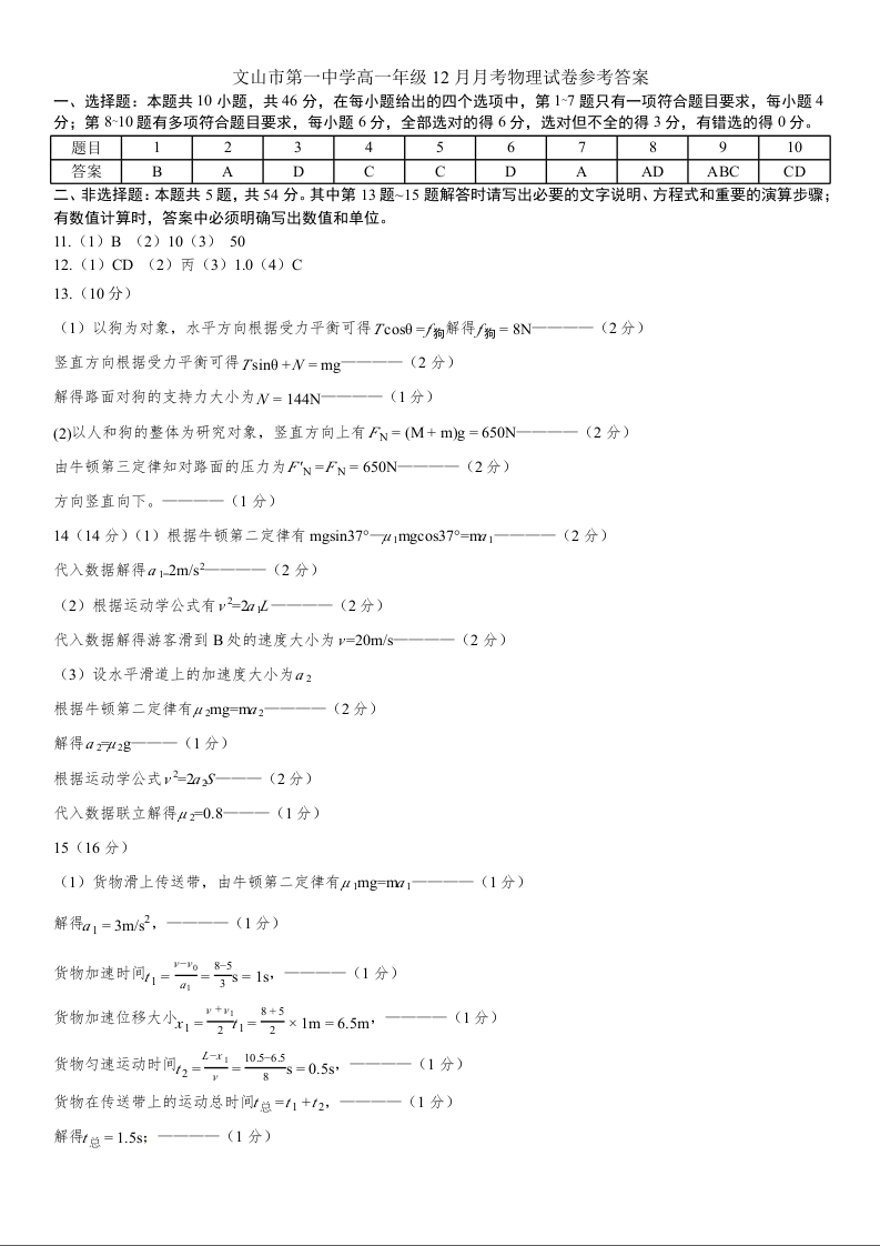 高一物理答案--云南省文山壮族苗族自治州文山市第一中学2025-2026学年高一上学期12月月考