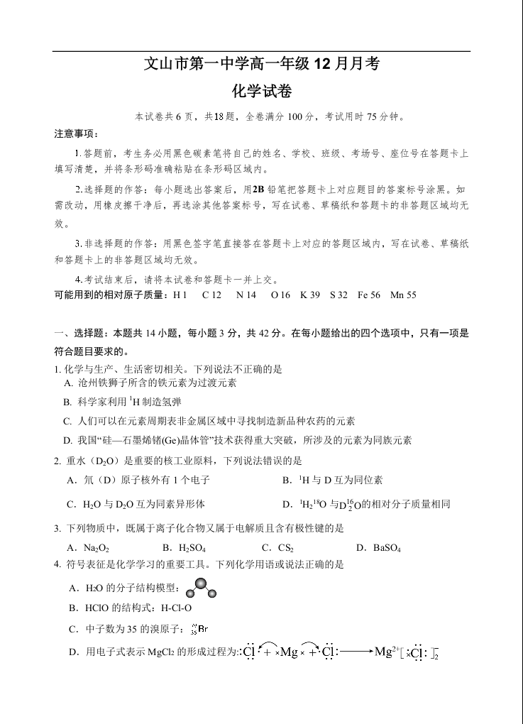 高一化学--云南省文山壮族苗族自治州文山市第一中学2025-2026学年高一上学期12月月考