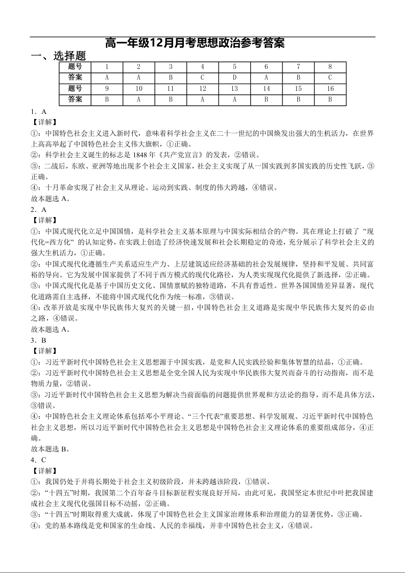 高一政治答案--云南省文山壮族苗族自治州文山市第一中学2025-2026学年高一上学期12月月考
