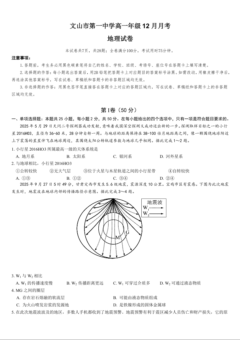 高一地理--云南省文山壮族苗族自治州文山市第一中学2025-2026学年高一上学期12月月考