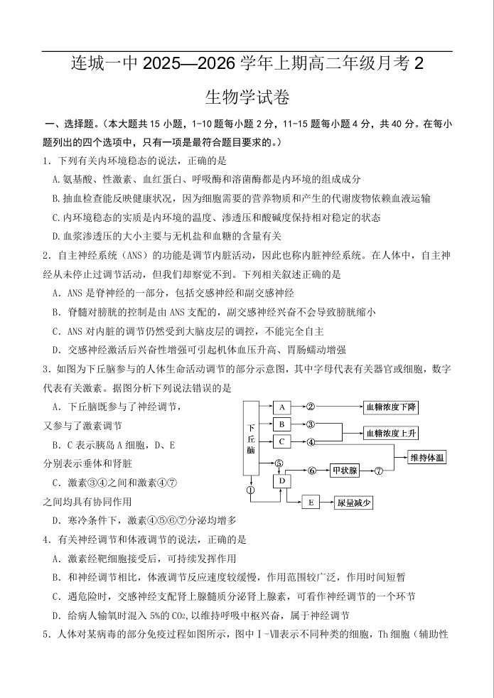 高二生物+答案--福建省连城县第一中学2025-2026学年高二上学期12月月考
