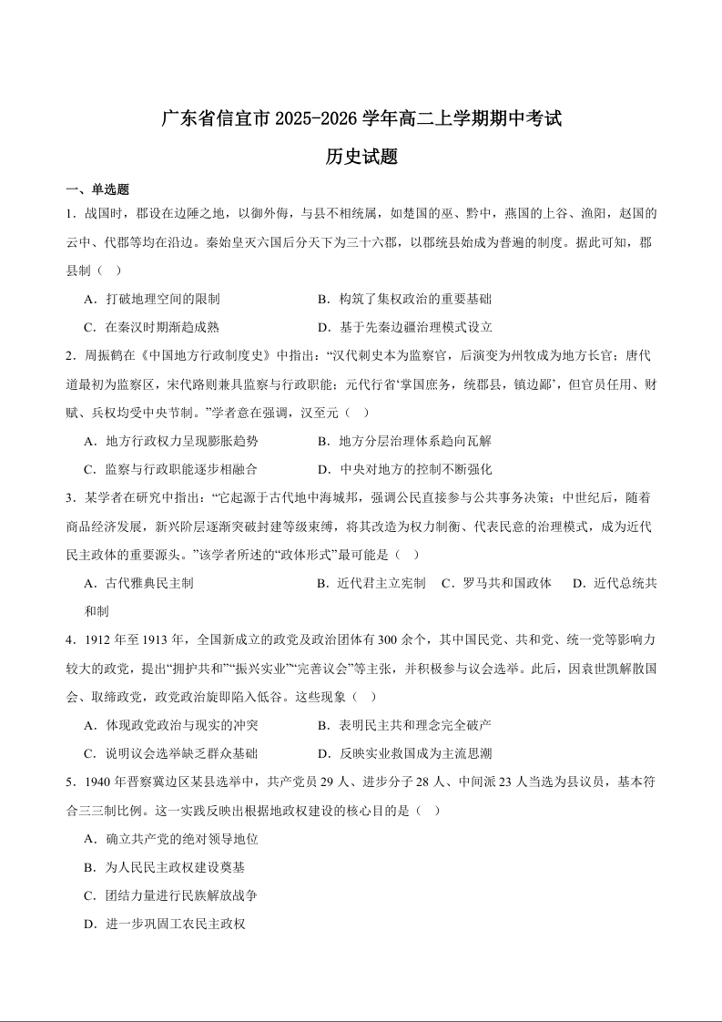 高二历史+答案--广东省茂名市信宜市2025-2026学年高二上学期期中考试