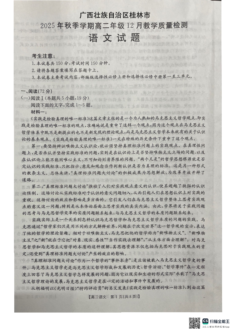 高二语文--广西壮族自治区桂林市十二县中学等2025-2026学年高二上学期12月期中