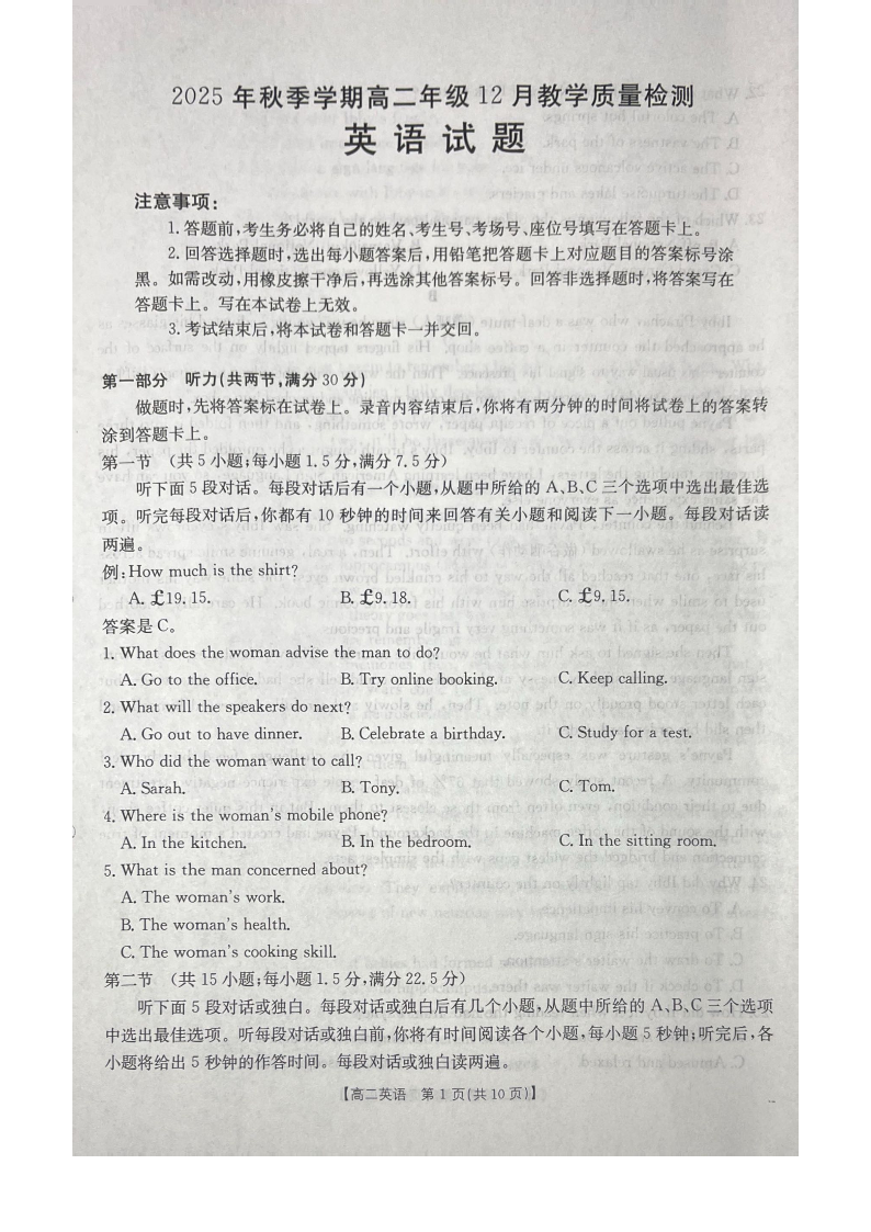 高二英语--广西壮族自治区桂林市十二县中学等2025-2026学年高二上学期12月期中