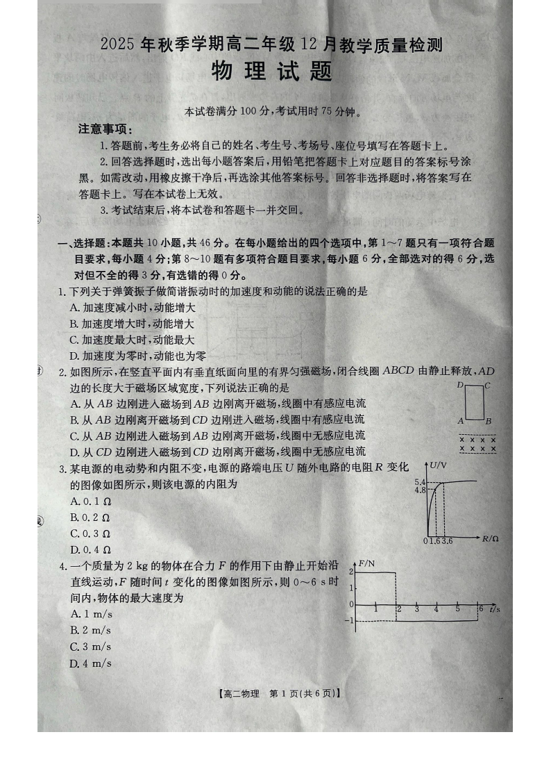 高二物理--广西壮族自治区桂林市十二县中学等2025-2026学年高二上学期12月期中