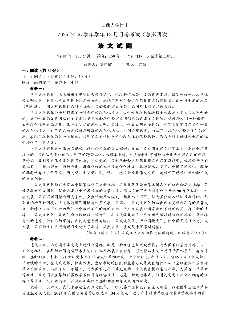高二语文--山西省太原市山西大学附属中学校2025-2026学年高二上学期12月月考