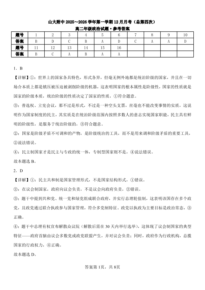 高二政治答案--山西省太原市山西大学附属中学校2025-2026学年高二上学期12月月考