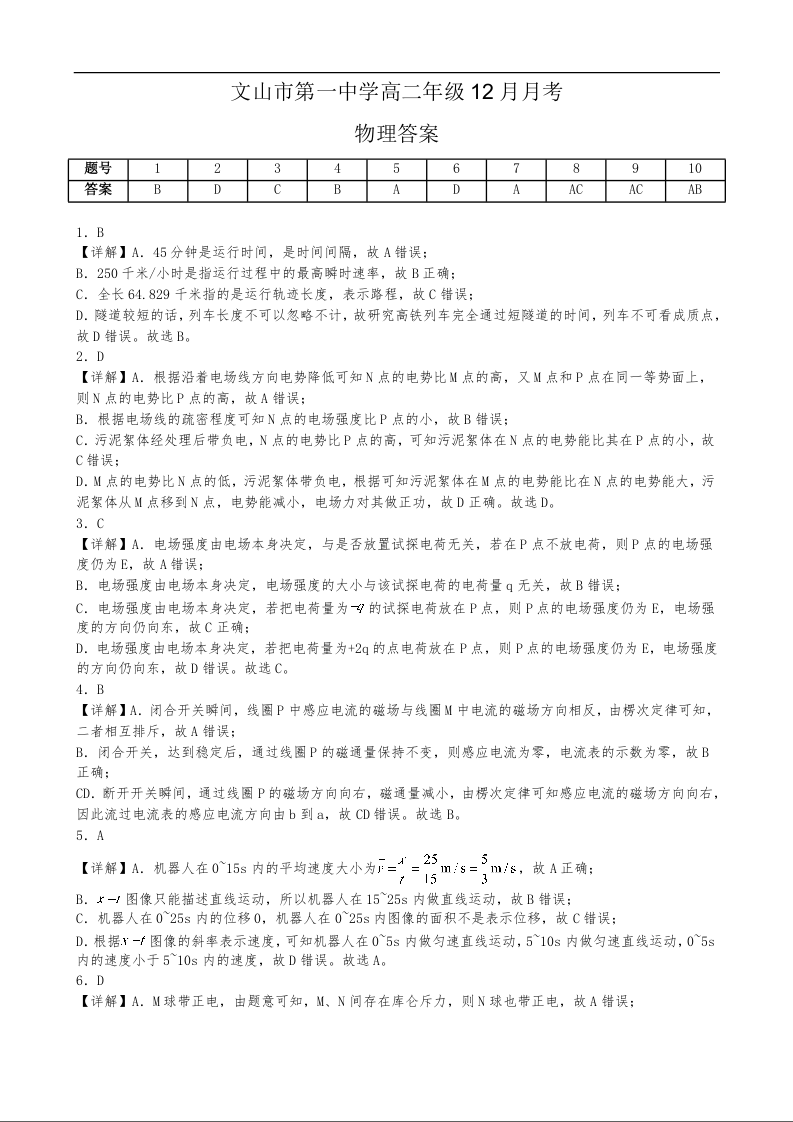 高二物理答案--云南省文山壮族苗族自治州文山市第一中学2025-2026学年高二上学期12月月考