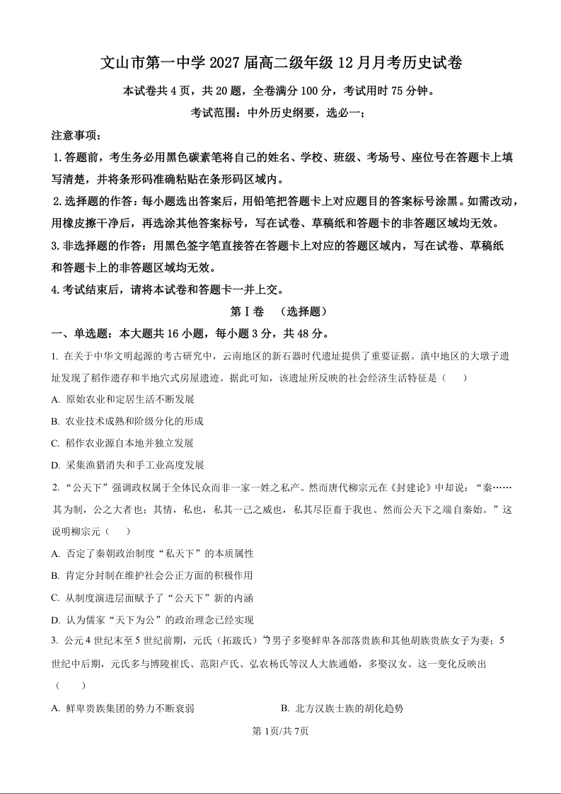 高二历史(原卷版)--云南省文山壮族苗族自治州文山市第一中学2025-2026学年高二上学期12月月考