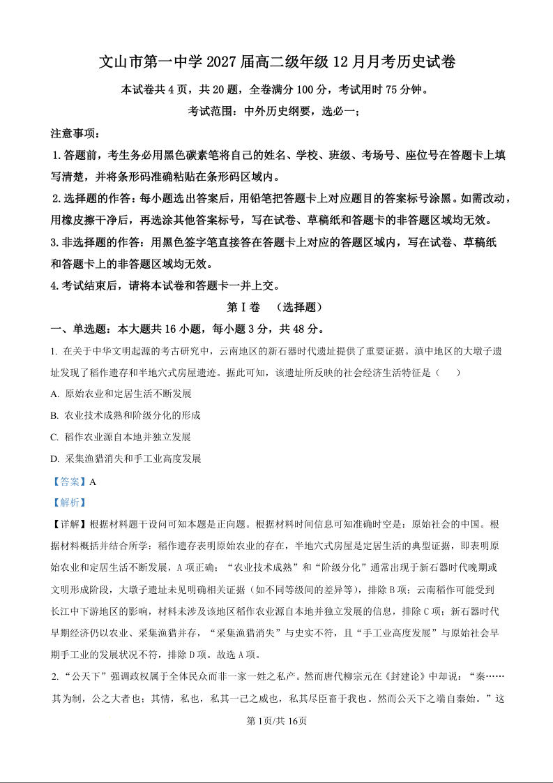 高二历史(精品解析版)--云南省文山壮族苗族自治州文山市第一中学2025-2026学年高二上学期12月月考