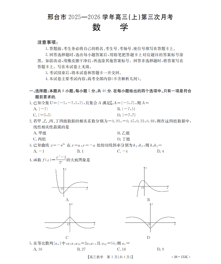 高三数学--河北省邢台市2026届高三上学期第三次月考