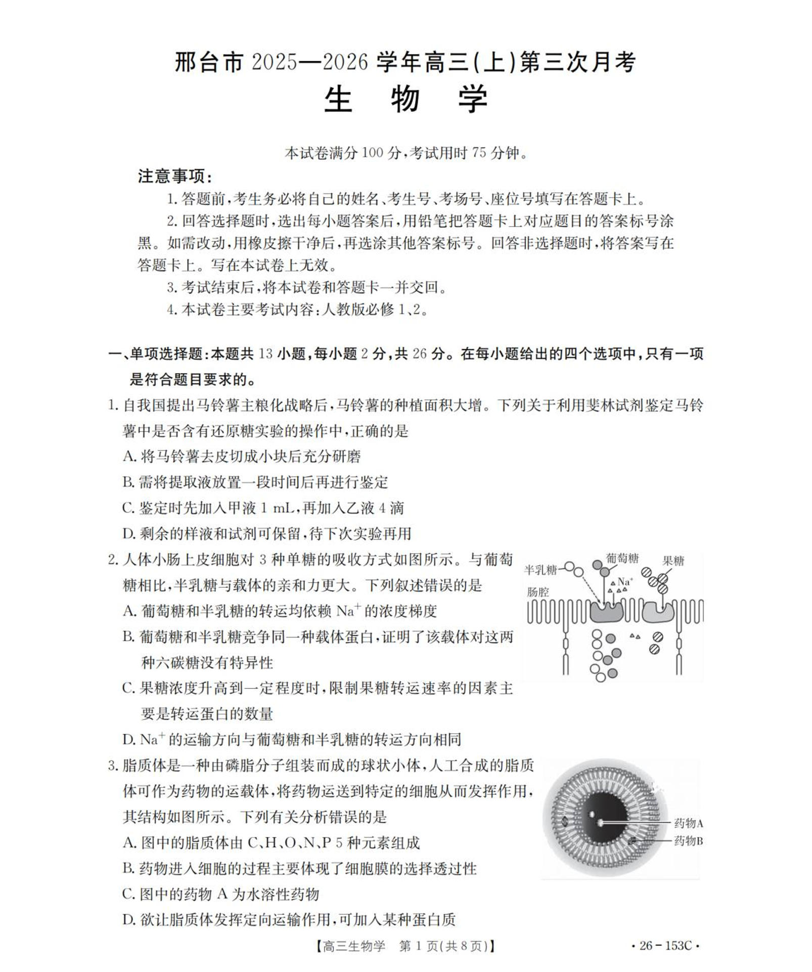 高三生物--河北省邢台市2026届高三上学期第三次月考