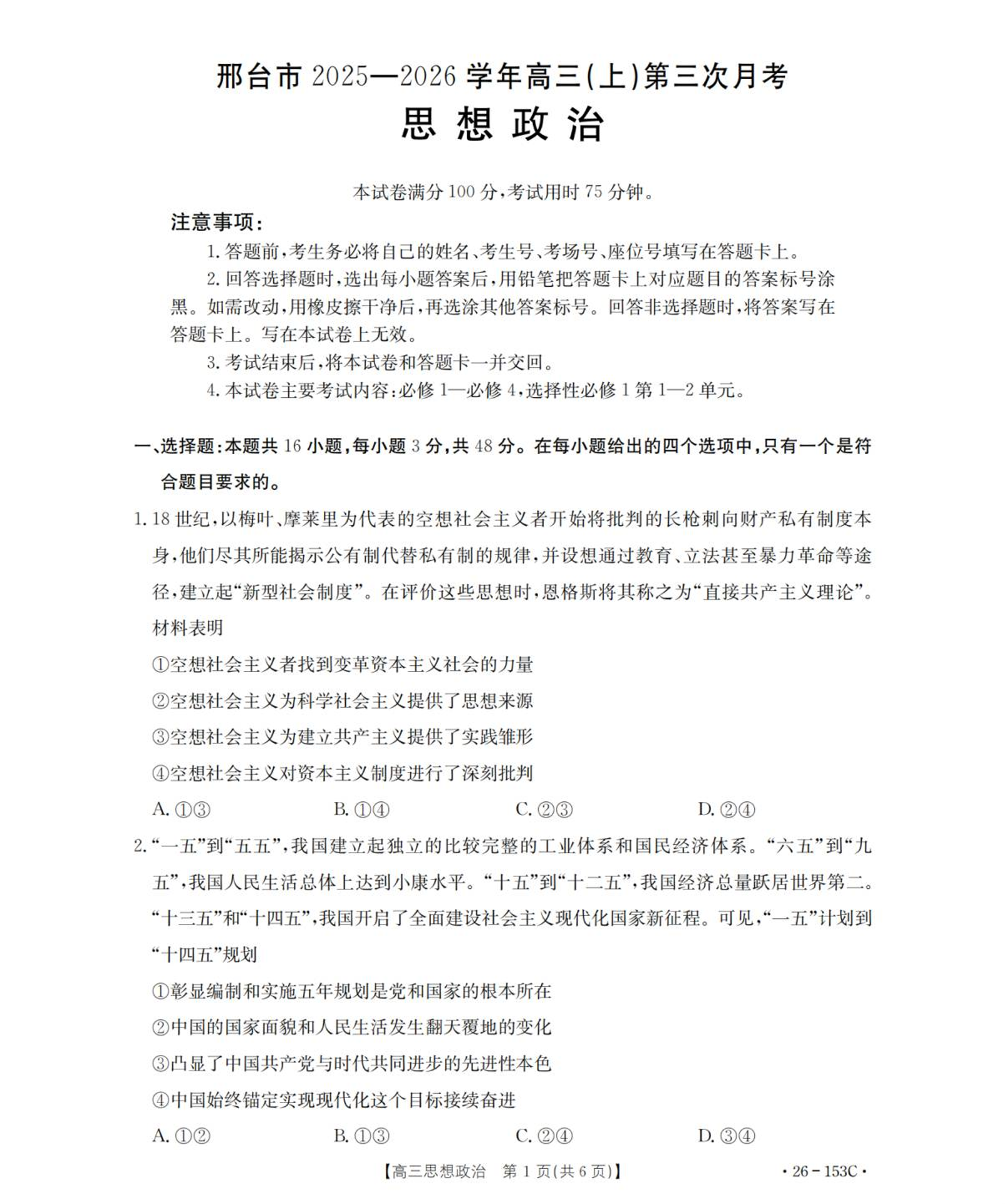 高三政治--河北省邢台市2026届高三上学期第三次月考