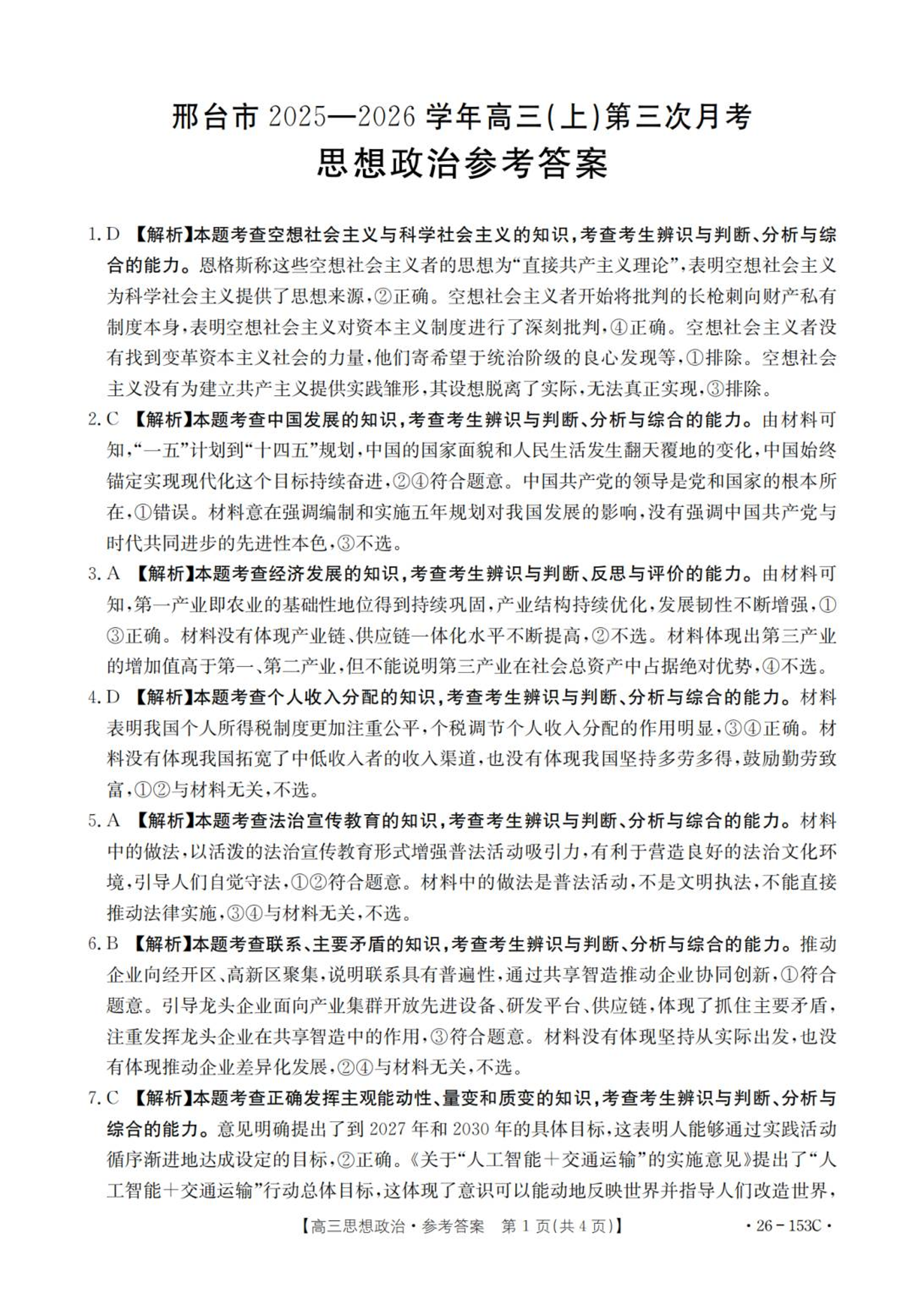 高三政治答案--河北省邢台市2026届高三上学期第三次月考