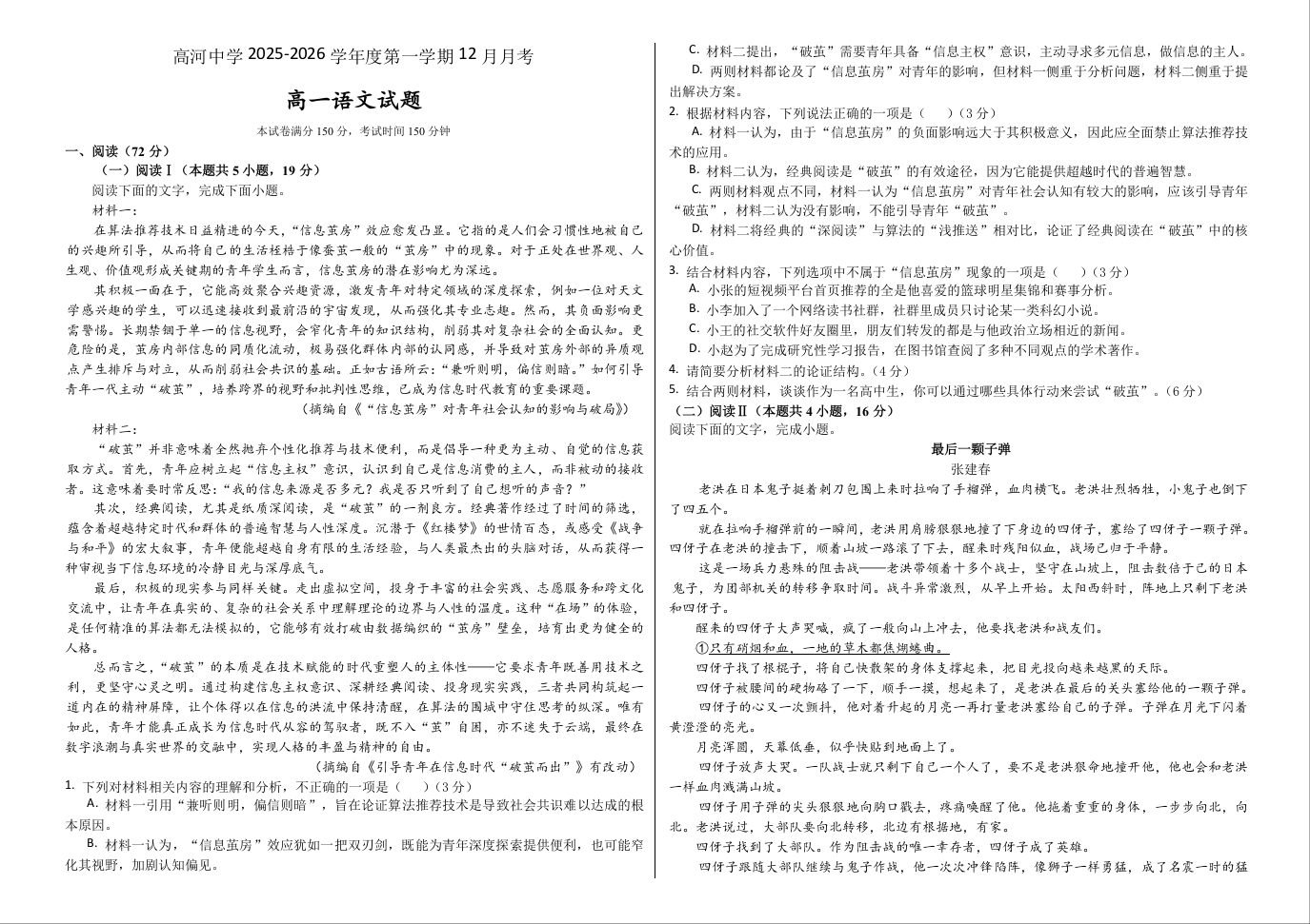 高一语文+答案--安徽省怀宁县高河中学2025-2026学年高一上学期12月月考