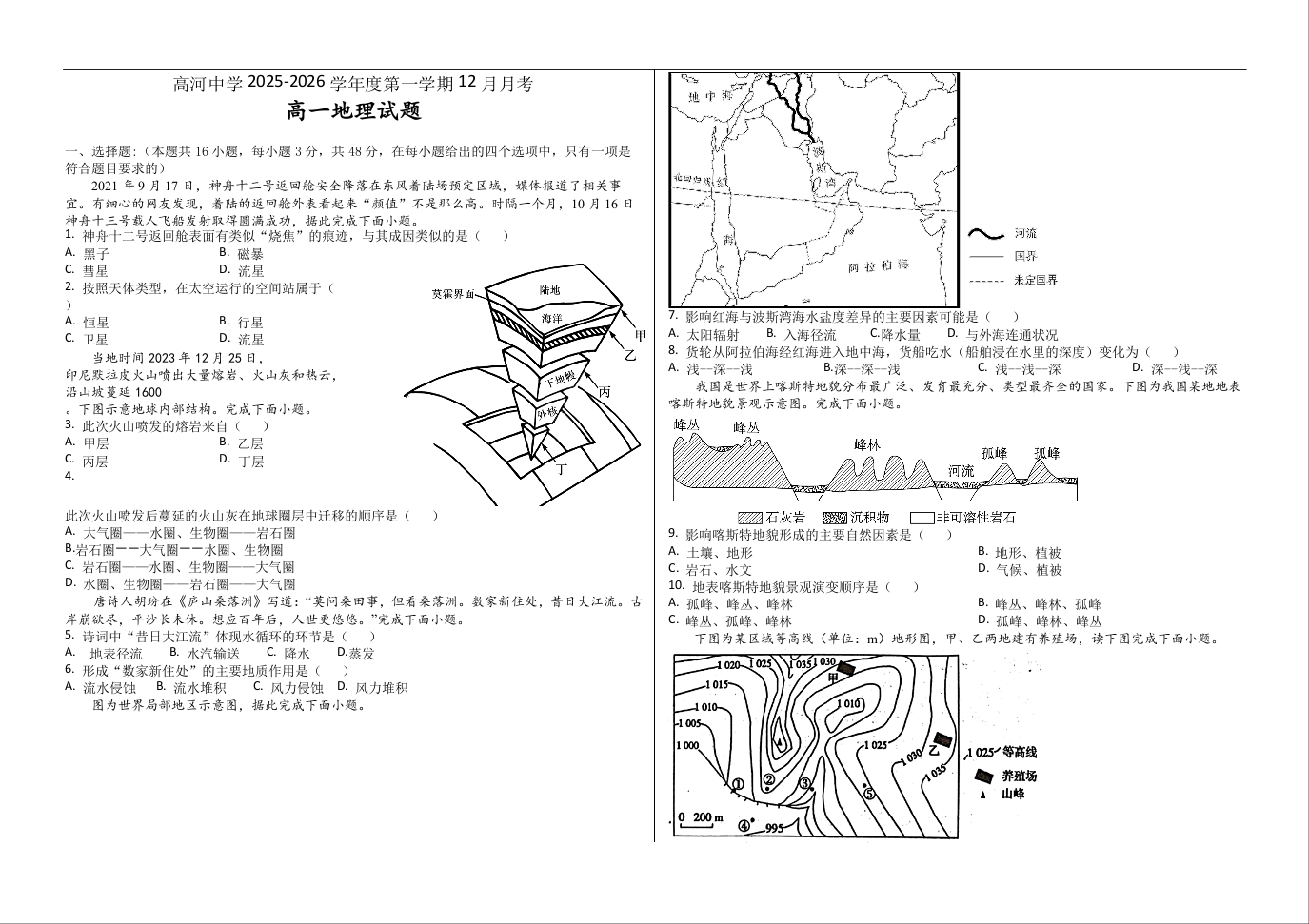 高一地理+答案--安徽省怀宁县高河中学2025-2026学年高一上学期12月月考