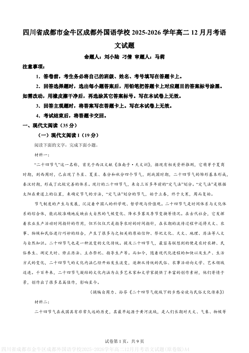 高二语文(原卷版)--四川省成都外国语学校2025-2026学年高二上学期12月月考