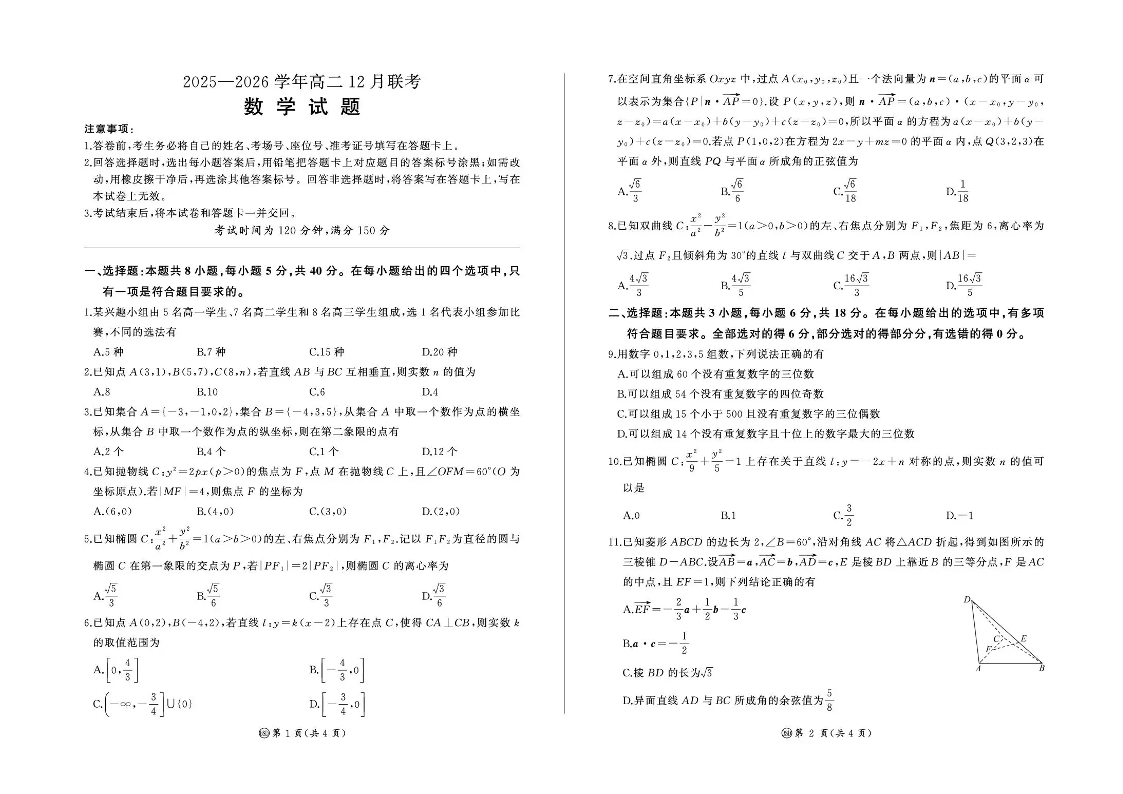 高二数学(北师大版)+答案--河南省百师联盟2025-2026学年高二上学期12月联考