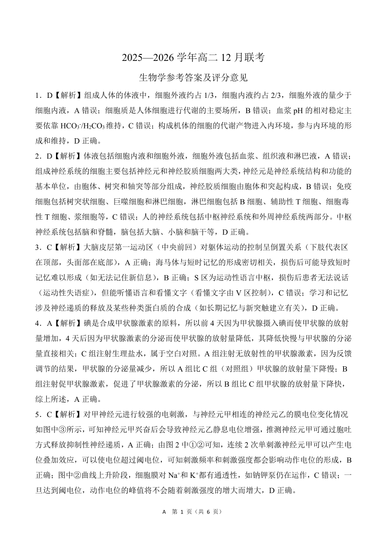 高二生物A答案--河南省百师联盟2025-2026学年高二上学期12月联考