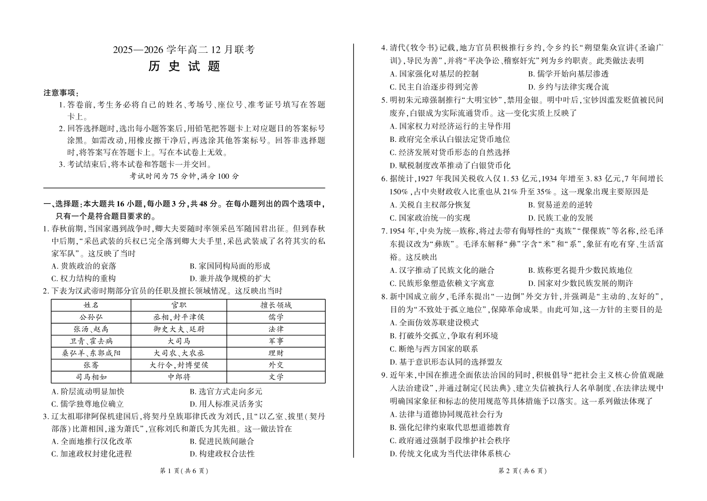 高二历史--河南省百师联盟2025-2026学年高二上学期12月联考