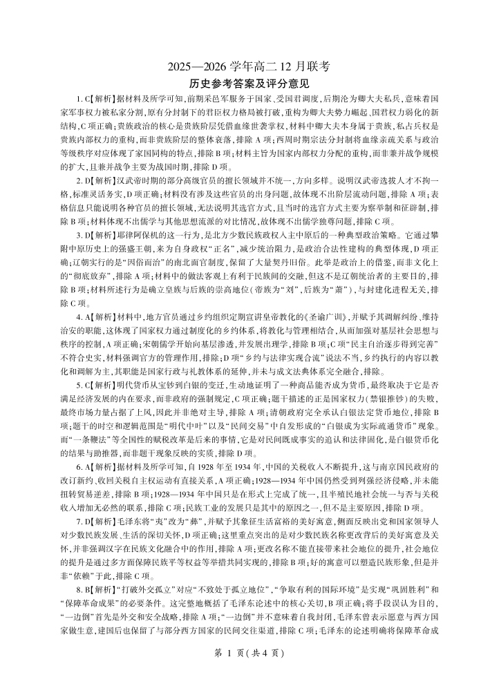 高二历史答案--河南省百师联盟2025-2026学年高二上学期12月联考