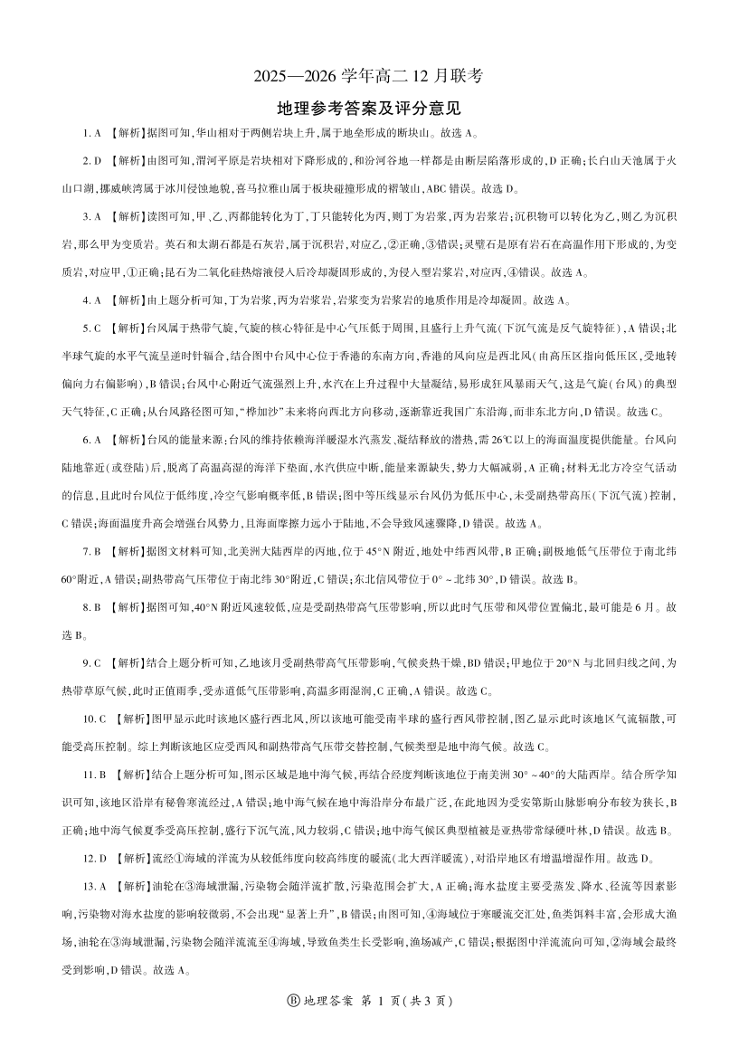 高二地理B答案--河南省百师联盟2025-2026学年高二上学期12月联考