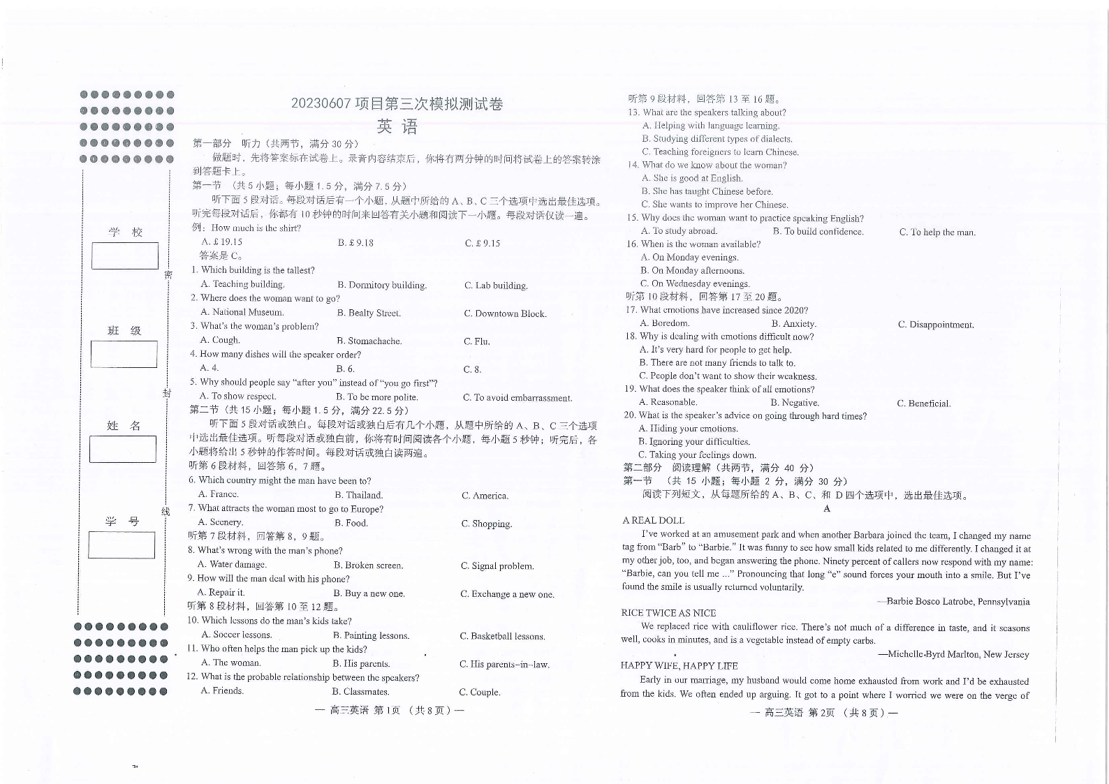 高三英语--江西20230607项目第三次模拟测试卷(南昌三模)