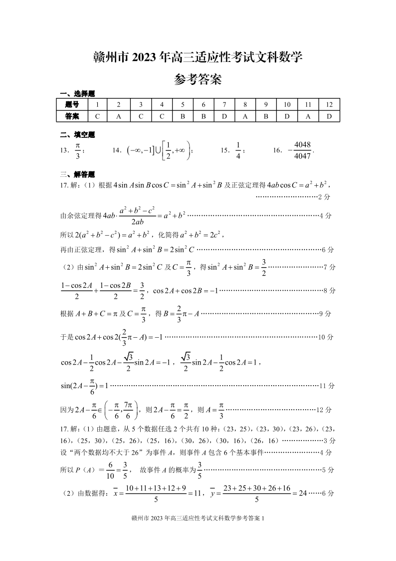 高三文数答案--江西省赣州市2025届高三第二次模拟考试