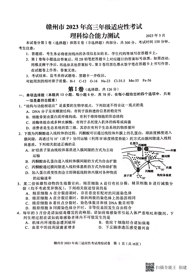 高三理综--江西省赣州市2025届高三第二次模拟考试