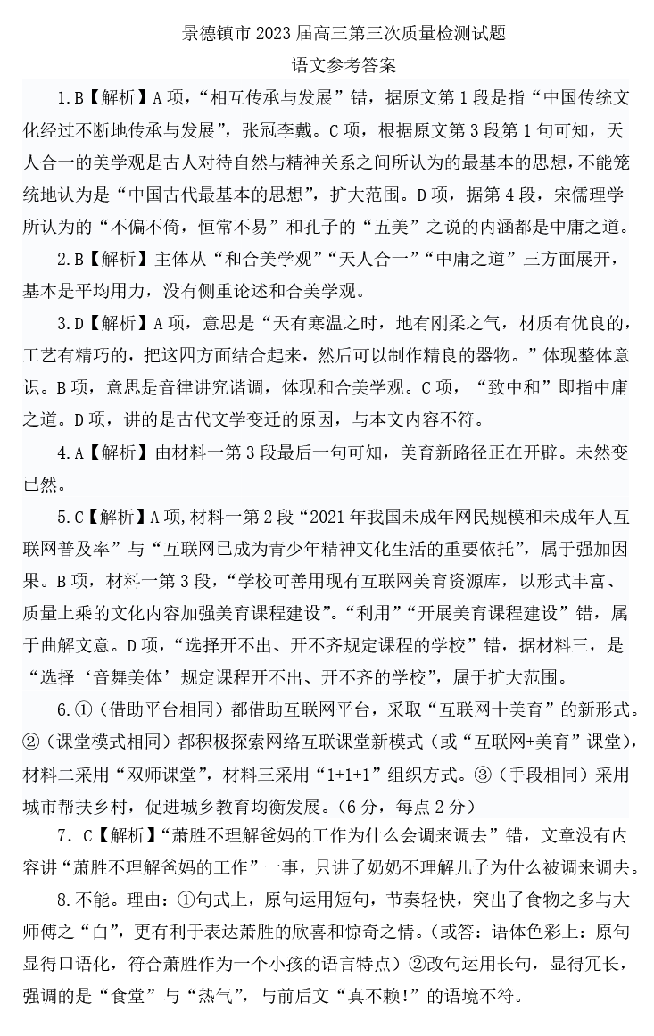高三语文答案--江西省景德镇市2023届高三第三次质量检测卷(景德镇三模)