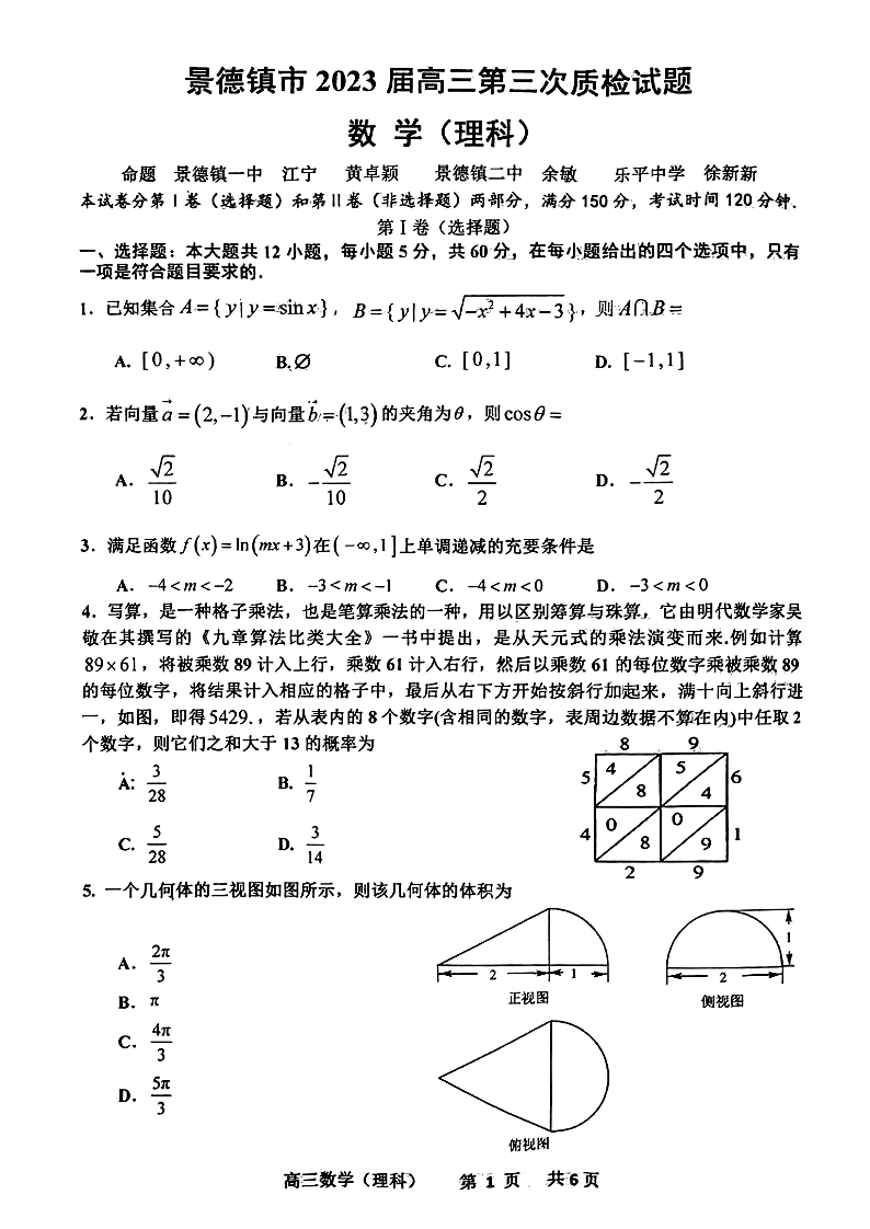 高三理数--江西省景德镇市2023届高三第三次质量检测卷(景德镇三模)