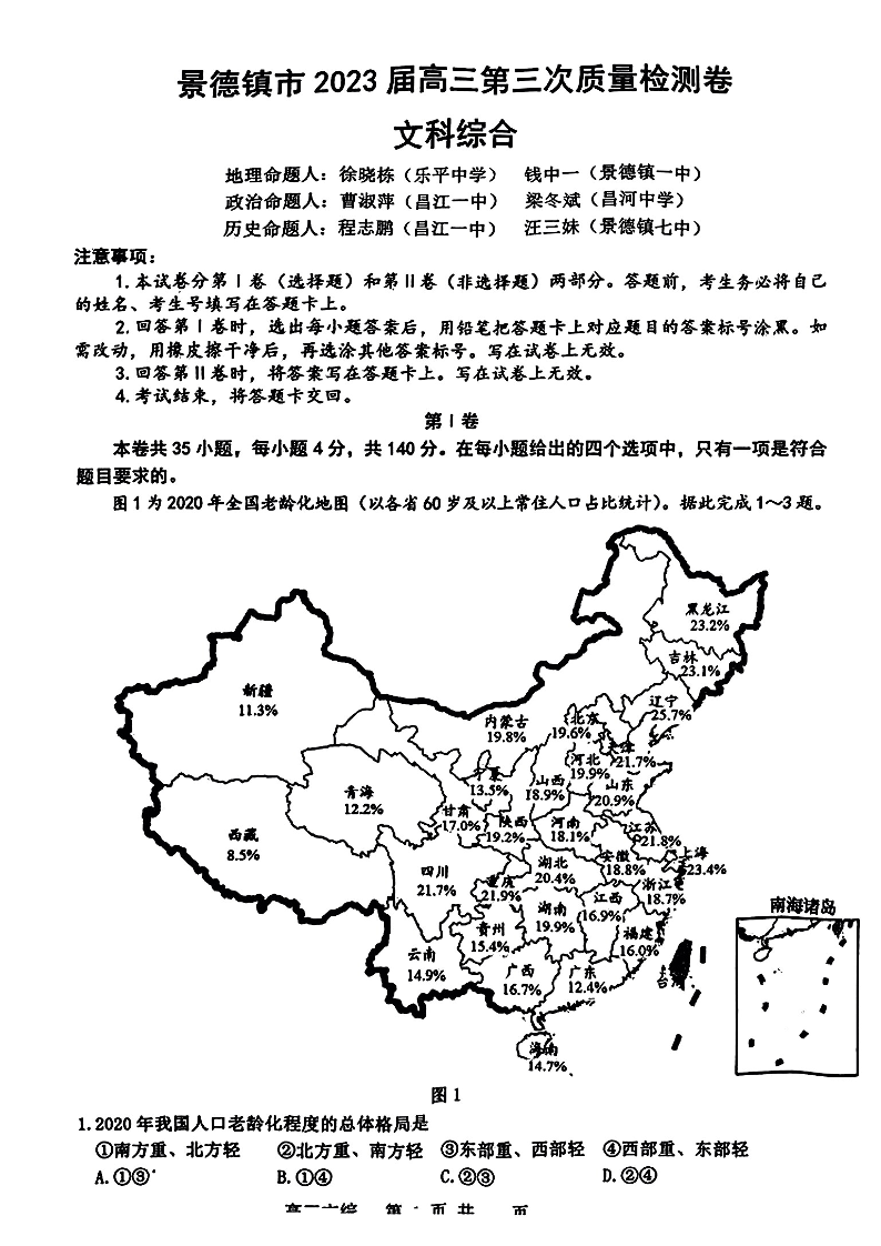 高三文综--江西省景德镇市2023届高三第三次质量检测卷(景德镇三模)
