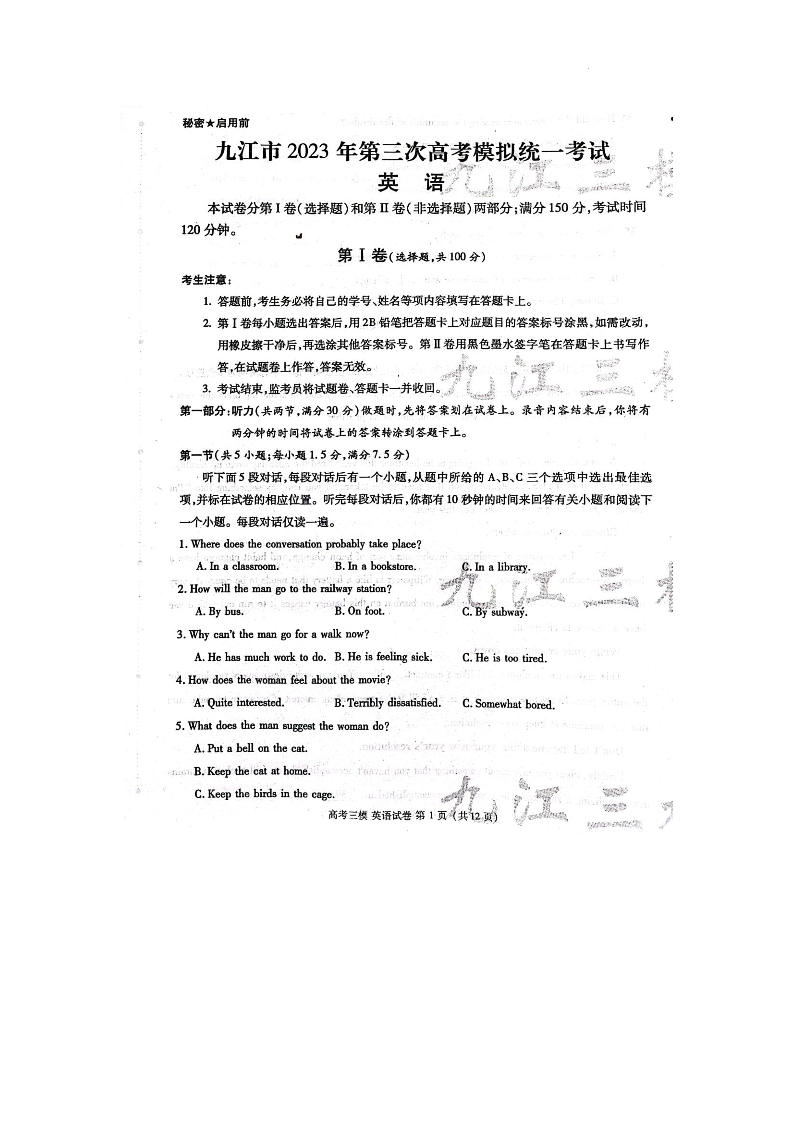 高三英语--江西省九江市2023届高三第三次模拟考试
