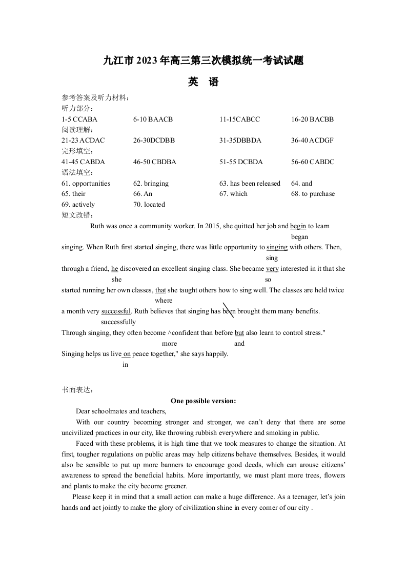 高三英语答案--江西省九江市2023届高三第三次模拟考试