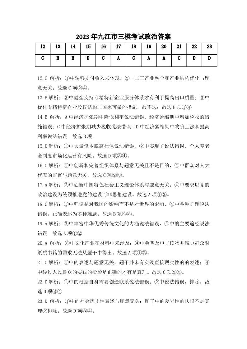高三政治答案--江西省九江市2023届高三第三次模拟考试