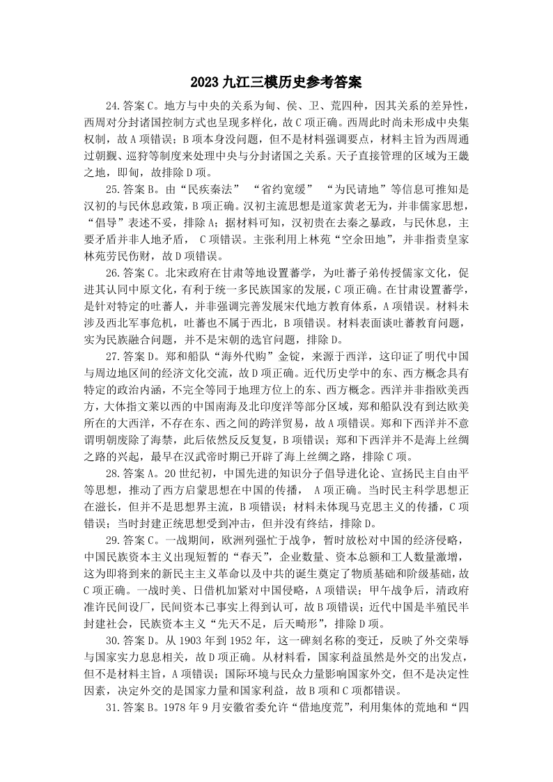 高三历史答案--江西省九江市2023届高三第三次模拟考试