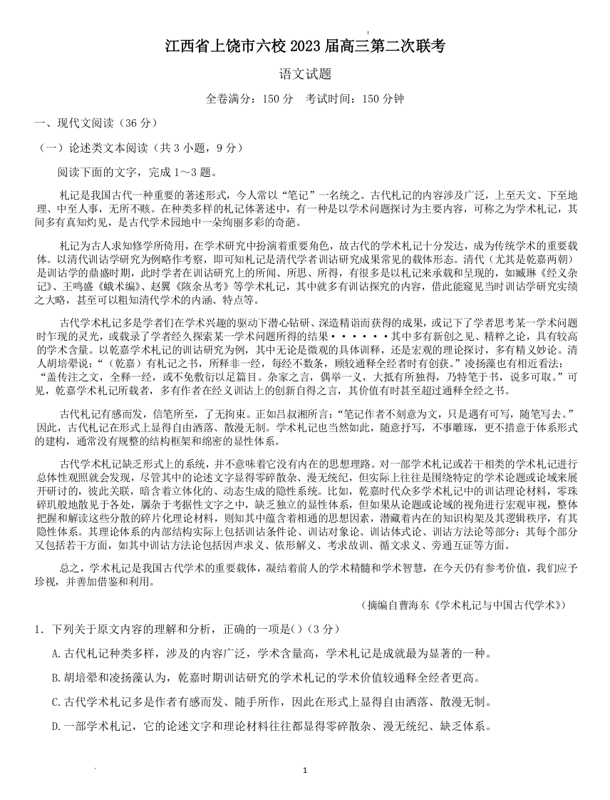 高三语文--江西省上饶市六校2023届高三第二次联考