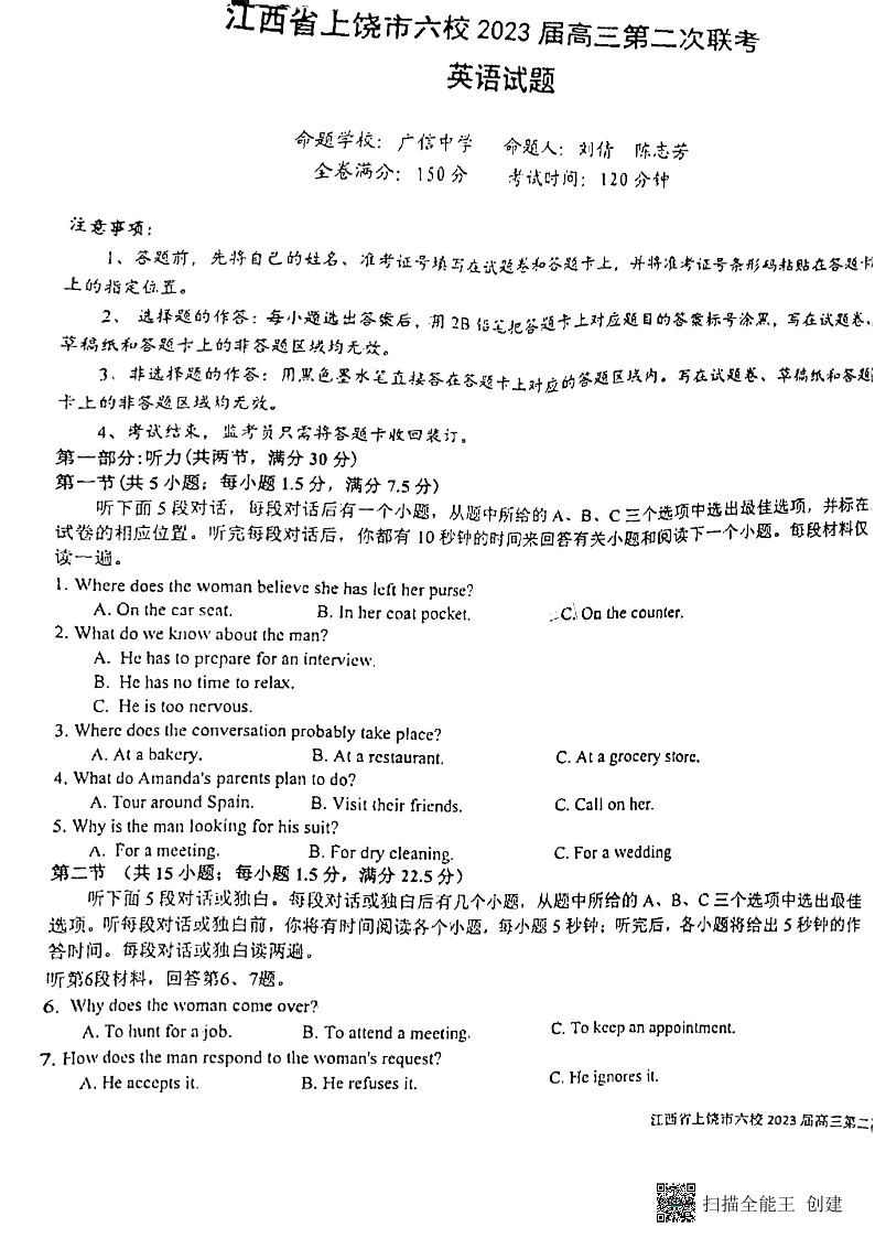 高三理综--江西省上饶市六校2023届高三第二次联考