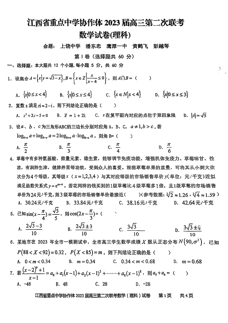 高三理数+答案--江西省重点中学九校协作体2023届高三第二次联考