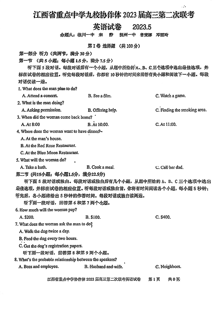 高三英语+答案--江西省重点中学九校协作体2023届高三第二次联考