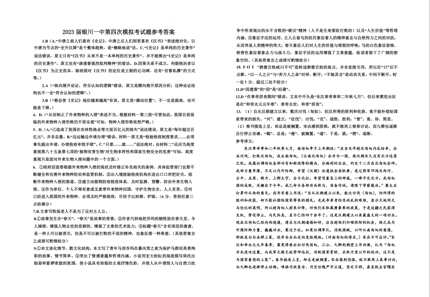 高三语文答案--宁夏回族自治区银川一中2023届高三第四次模拟考试
