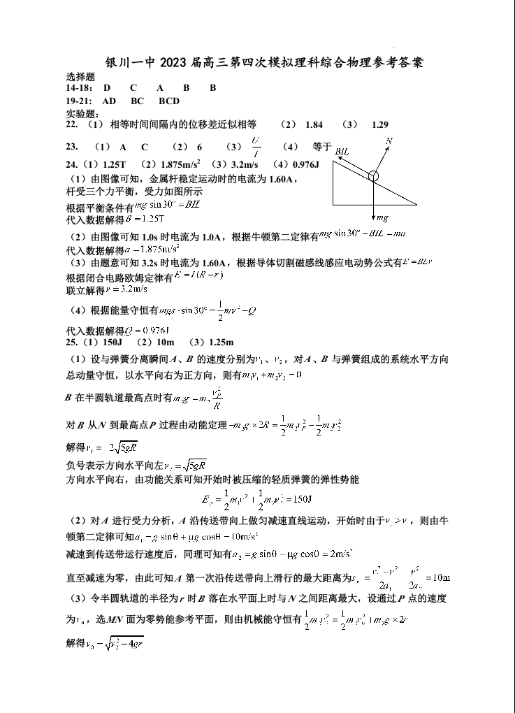 高三物理答案--宁夏回族自治区银川一中2023届高三第四次模拟考试