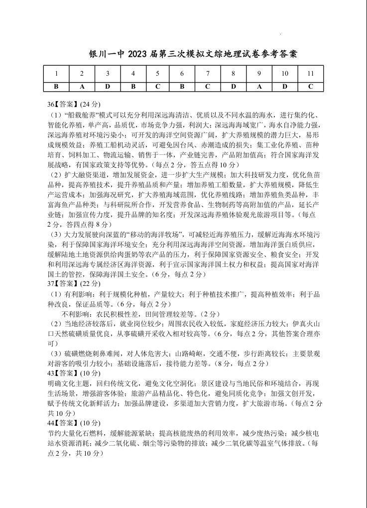 高三地理答案--宁夏回族自治区银川一中2023届高三下学期第三次模拟