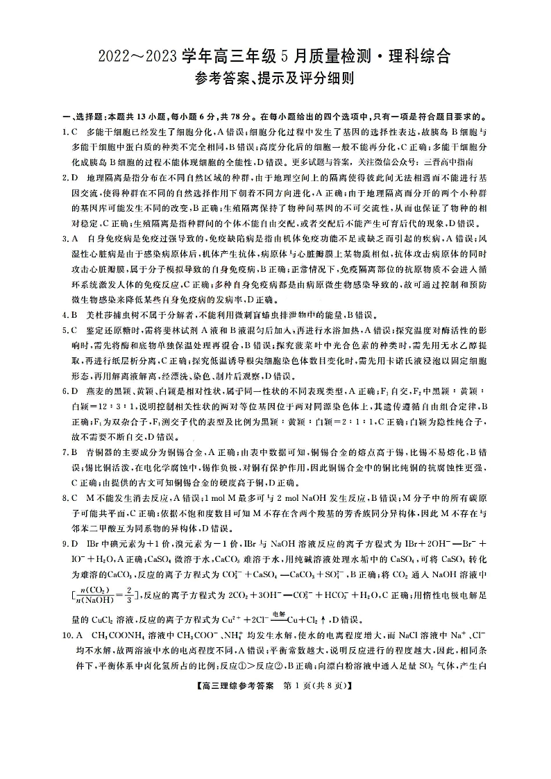 高三理综答案--山西省大同市高三三模