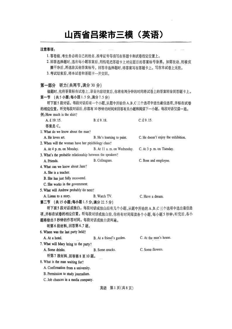 高三英语+答案--山西省吕梁市2023届高三下学期三模
